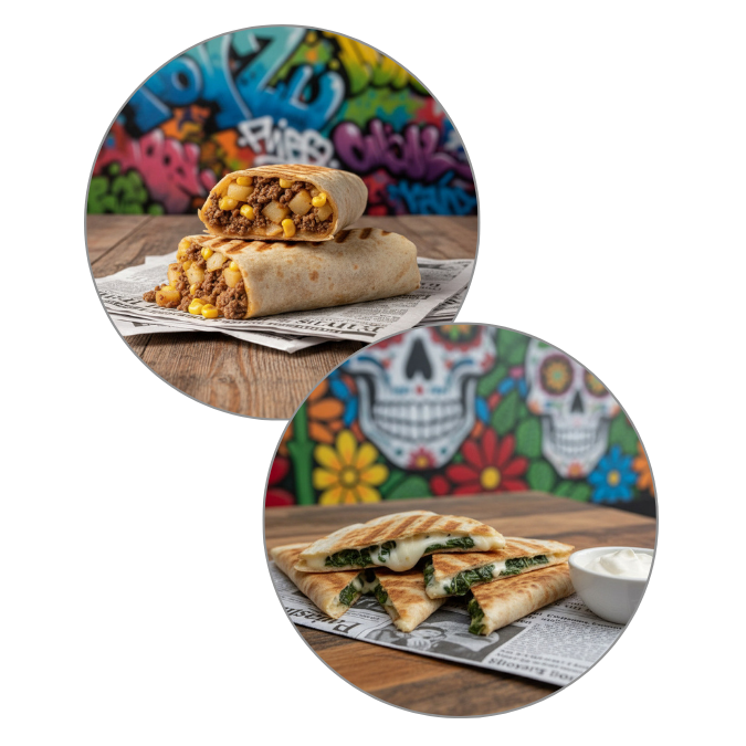 Von saftigen Burritos über knusprige Quesadillas bis hin zu Nachos mit verschiedenen Toppings – unser mexikanisches Streetfood bietet für jeden Geschmack das Richtige.
